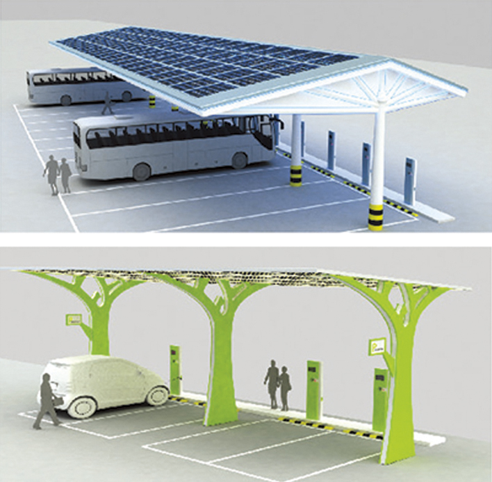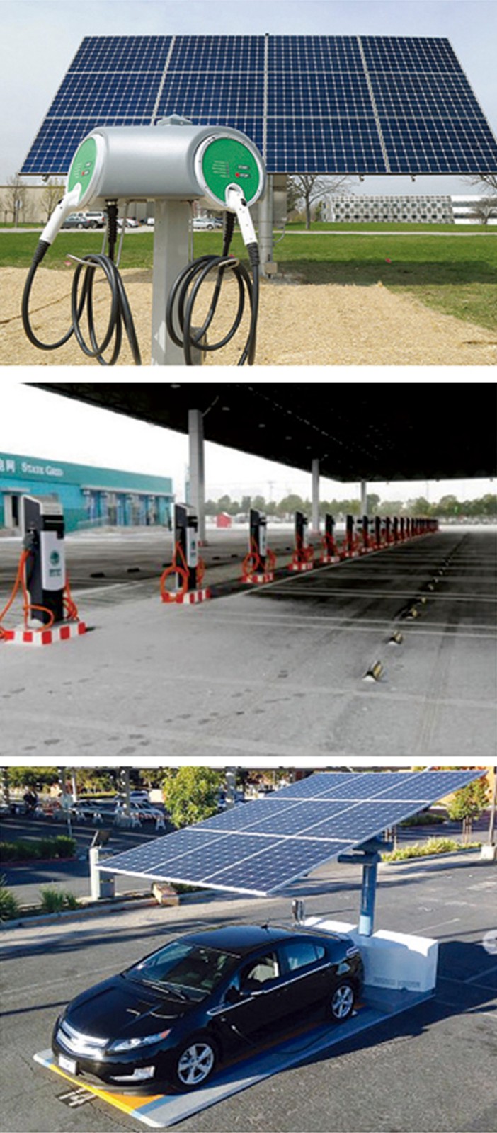 太陽能充電站配有太陽能光伏發電系統和蓄電設備,蓄電設備主要是蓄電池,太陽能發的電儲存在蓄電設備中,通過逆變器輸出交流220V的電壓,并結合電動車充電機即可完成對電動車的充電。